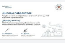 Ученик 3 класса Иванов Данияр принял участие в Республиканской открытой робототехнической онлайн-олимпиаде 2020. Он набрал большое количество баллов в категории "Основная. Младшая" и стал победителем. Данияр награждён Дипломом победителя, а руководитель Бурганов Т. Ю. награждён Благодарностью за подготовку призёра.