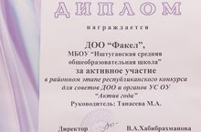 ДОО “Факел” нашей школы награждена Дипломом за активное участие в районном этапе республиканского конкурса для советов ДОО и органов УС ОУ “Актив года”, руководитель Танасева М. А.