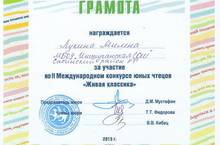 23 апреля 2013 года на базе МБОУ "Лицей №9 им.А.С.Пушкина" Зеленодольского муниципального района состоялся республиканский этап Всероссийского конкурса юных чтецов "Живая классика" среди уч-ся 6 классов общеобразовательных учреждений 11-12лет.В этом конкурсе приняла участие наша ученица 6 кл.Лукина Милена (руководитель Макарова М.В. учитель русского языка и литературы), которая была награждена грамотой.Искренне поздравляем Милену и желаем дальнейших успехов!