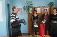 Преподаватель-организатор ОБЖ Маркелов Пётр Прокопьевич провёл обучение с сотрудниками школы на тему "Применение средств пожаротушения".