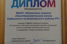 Район тарафыннан үткәрелгән IT-чемпион конкурсында мәктәбебез "Иң актив мәктәп" номинациясендә 2нче урынга лаек булды. Шулай ук укучыларыбыз Хадиева Зилия һәм Нәгыймов Әмир дә бу конкурста актив катнашып, җиңүчеләр булдылар. Барлык катнашкан укучыларга, сыйныф җитәкчеләренә, әти-әниләргә зур рәхмәтебезне җиткерәбез.