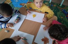 Бүген балалар рәсем шөгылендә көзге агач яфракларын ак битләргә төшерделәр һәм үз төсләренә буядылар. Балалар осталыгы белән төшерелгән көзге яфраклар бик матур килеп чыктылар.