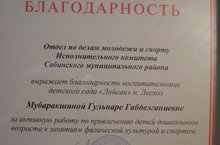 Отдел по делам молодёжи и спорту Исполнительного комитета Сабинского муниципального района выразил благодарность воспитателям подготовительной группы Мубаракшиной Г. Г. и Шаймиевой Ч.Ф. за активную работу по привлечению детей дошкольного возраста к занятиям физической культурой и спортом.