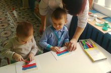 Бүген әвәләү шөгелендә ясаган рәсемгә пластилин сылау ысулы белән Россия флагы ясадык.Флагның төсләрен тирәнтен өйрәндек.