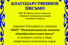 Дару үләннәре җыю буенча районыбыз республикада II урынны алды. Әлеге уңышта безнең мәктәбебез укучыларының да өлеше бар. Мәктәбебезгә Рәхмәт хаты тапшырылды.