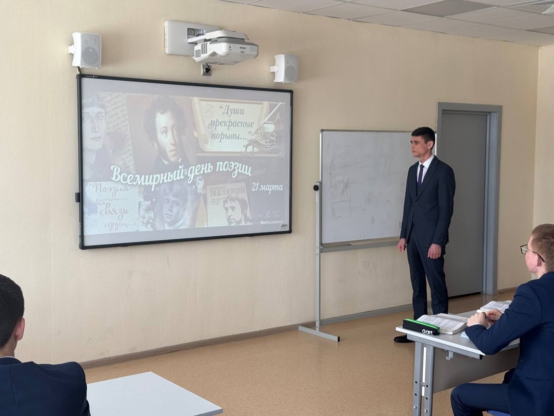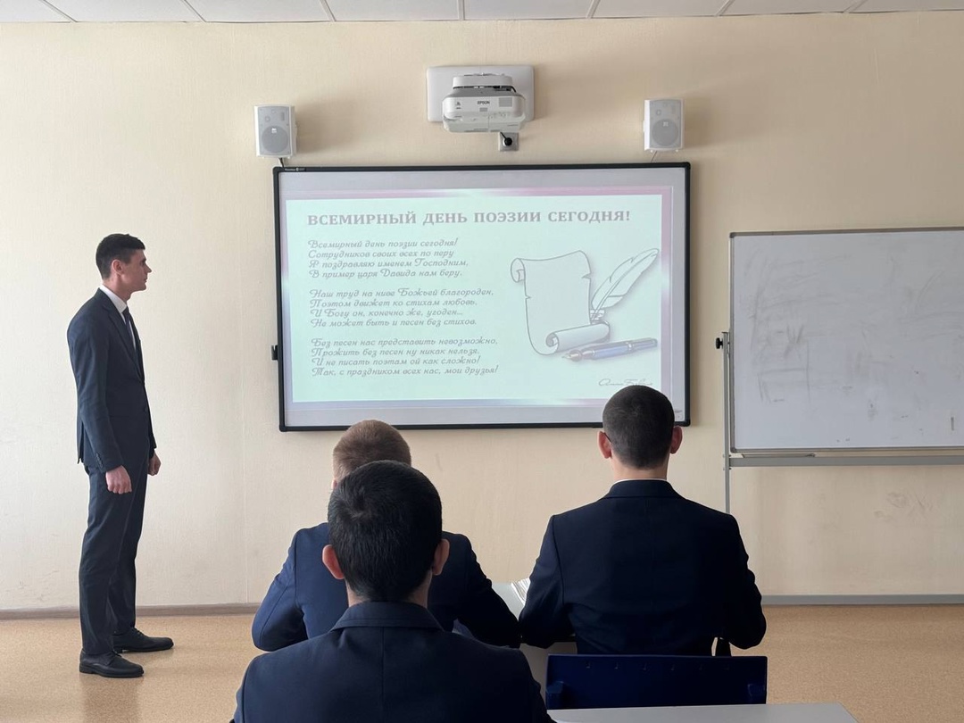 Опубликовано: 21.03.2025Сегодня, 21 марта, во Всемирный день поэзии советник директора по воспитанию и взаимодействию с детскими общественными объединениями Хазиев Р.Р для обучающихся 1 курса провел Литературную гостиную « Мелодия стихов»