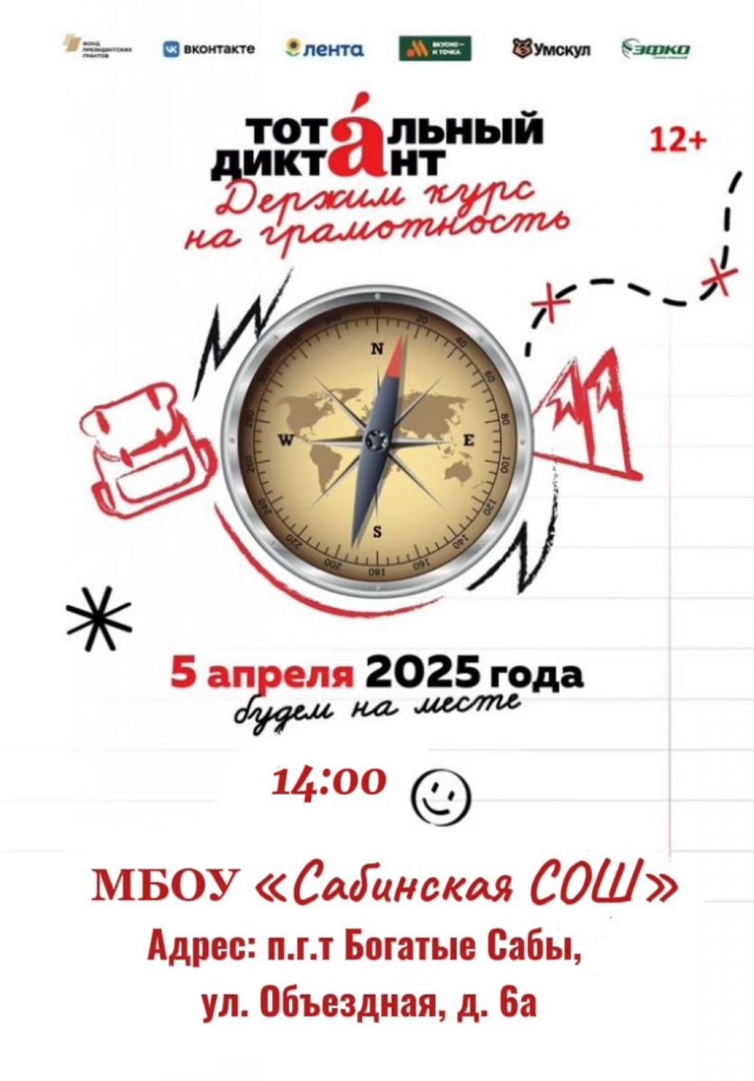 5 апреля 2025 года в 14:00 на базе МБОУ «Сабинская СОШ» запланировано проведение Международной образовательной акции «Тотальный диктант». В рамках акции все желающие смогут написать диктант по русскому языку. Цель акции – объединить носителей русского языка из разных городов и стран и показать им, что «заниматься русским языком нелегко, но полезно», а грамотность остается модной.