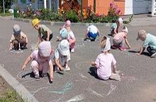 Рисовать цветными мелками, да еще не на бумаге, а на асфальте — это счастье для наших маленьких художников. Сегодня асфальт под ногами превратился в холст, а фантазия не знала границ. Асфальт расцветал удивительными красками, желтое солнце светило неровными лучами, цветы, бабочки и гусеницы дополнили картину летнего дня.