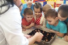 Сегодня старшая и подготовительная к школе группа научились посадить лук.Каждый ребенок вкладывал свою луковку в лунку "носиком вверх-хвостиком вниз". Воспитатель маленькой лопаткой присыпала все луковицы. Дети по очереди поливали лук из маленьких леечек с двух сторон ящика. "Будем поливать наши посадки каждый день и очень скоро появятся первые росточки. Каждый день будем наблюдать", - говорит педагог, заканчивая наблюдение.