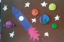 Дети второй младшей группы совместно с воспитателем Гафиятуллиной Ф.Р. «сели в ракеты» «полетели в космос» покорять вселенную. Ракеты сделаны по технике аппликации.