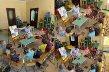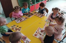 Сегодня в нашей ясельной группе было очень интересное занятие! Мы с малышами "рассказывали", как они обедают. Сначала мы внимательно рассмотрели картинку, на которой были изображены детки за столом. Ребята с удовольствием показывали, где тарелка, а где чашка, и даже нашли блюдце!