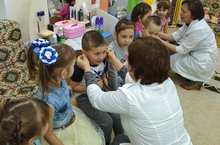 Балаларны әти-әниләрнең һөнәре белән тагын да якыннан таныштыру максатыннан зурлар төркеме группасына шәфкать туташы һәм табиб әниләребезне кунакка чакырдык. Саба үзәк шифаханәсендә эшләүче Габтерахманова Гөлия Васыйл кызы, Ибрагимова Ләйлә Мөдәрис кызы , Ханипова Чулпан Вәлиәхмәт кызы бу очрашуга бик теләп килделәр. Алар балаларга үзләренең хезмәтләре, ни өчен бу һөнәрне сайлаулары, авыру белән ничек итеп аралашырга кирәклеген бик матур итеп сөйләделәр, медицина приборлары белән таныштырдылар, яраланганда беренче ярдәм күрсәтергә өйрәттеләр. Стоматология бүлегендә эшләүче Чулпан апа Ханипованың теш макеты ярдәмендә дөрес итеп теш чистартырга өйрәтүе, Ләйлә Ибрагимованың “бәби”не төреп күрсәтүе, махсус прибор ярдәмендә үзләренең йөрәк тибешләрен тыңлап карау - балалар өчен иң мавыктыргычы булды. Бакчабызда тәрбияләнүче балалар Кәрим, Сөмбел һәм Рөстәмнең әнисенә зур рәхмәтләребезне җиткерәбез.