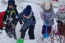 Начались каникулы. Воспитанники нашего детского сада с удовольствием вышли на прогулку, взяли с собой хлеб, зерна, семечки для того, чтобы подкормить птиц. А лопатами, которые дети заранее принесли из дома, расчистили дорогу к кормушкам. Таким образом, прогулка стала еще интересней, полезней и дети довольные, румяные вернулись с прогулки.