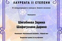Во IIl возрастной категории (11-12 лет) в номинации Фортепиано (соло) Набиулина Камиля завоевала Диплом Лаурета l степени.В IV возрастной категории ( 13-15лет) Хисамиева Марьям и Габдрахманова Дина завоевали Дипломы Лауреатов ll степени. В категории 2 года обучения в номинации "Первый шаг" Фортепианный ансамбль Шигабиева Зарина и Шафигуллина Дарина завоевали Дипломы Лауреатов 2 степени. В категории 3 года обучения в номинации " Первый шаг" Фортепиано (соло) Мухутдинова Диана завоевала Диплом Лауреата 1 степени.За педагогическое мастерство преподаватель Мухутдинова Э. Н.отмечена благодарственным письмом.