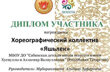 Хореографический коллектив "Яшьлек" ( руководитель Мубаракзянова Альбина Зуфаровна ) МБОУ ДО "Сабинская ДШИ имени Хуснуллы и Аллагияр Валиуллиных" принимала участие в 1 туре Международного и Всероссийского конкурсов исполнителей татарского танца "Шома бас" и "Эпипэ", которые проходили в онлайн формате в г. Екатеринбурге в декабре 2025 г. С хореографическим номером " Сабантуй булэге " коллектив прошел на 2 ой тур и был награждён дипломом участника.