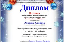 30 декабря 2025 года были определены результаты Всероссийского творческого конкурса детских тематических рисунков «Волшебный новый 2026 год!». В номинации: «Творчество без границ» название работы: «Фронтовая сестра»,«Возвращение домой» приняли участие преподаватель художественного отделения МБОУ ДО «Сабинская ДШИ» Галиева Эльвира Раефовна и её ученица 3 класса (ФГТ- 5 лет обуч.) Ахатова Альфиза Данилевна. Они награждены дипломами II степени, чем мы их и поздравляем! Желаем рдальнейших успехов и новых достижений! В конкурсе участвовали: 1 преподаватель, 1 учащийся.
