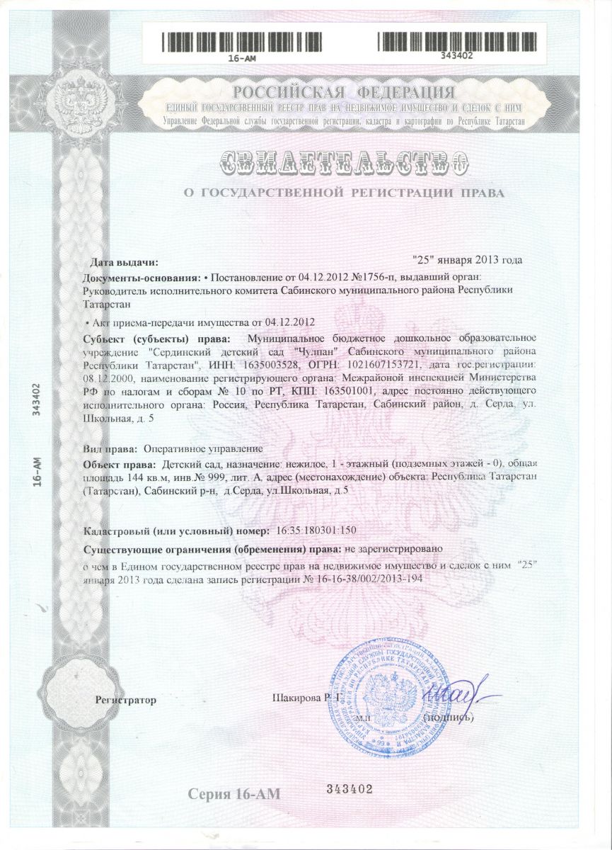 Свидетельство о гос.регистрации на здание детского сада
