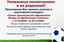Уважаемые воспитанники и их родители!!! Приглашаем Вас принять активное участие в кулинарном конкурсе "Самое оригинальное оформление блюда на футбольную тематику". Конкурс проходит в рамках Всероссийского фестиваля "Футбол в школе". Срок с 17.12.2025 по 22.12.2025. Желаем всем творческих успехов!!!