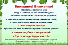 В рамках Республиканской акции "Эковесна 2025", в санитарно-экологический двухмесячник в детском саду стартовала акция по уборке территорий "Пусть всегда будет чисто!". Приглашаем всех желающих активно принять участие в данной акции, проявив заботу об окружающей среде.