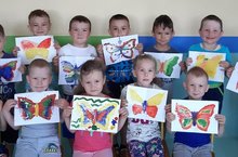 - Сложите лист пополам, придавите, раскройте его. На второй половине листа отпечаталось второе крыло.
