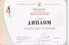 В г.Казане прошел II-Международный литературный конкурс "Джалиловские чтения", в котором принял участие победитель зонального тура наш музыкальный руководитель Загидуллин И.Р. По итогам конкурса он был удостоен Диплома II- степени. Поздравляем с успешным выступлением, желаем новых творческих успехов!