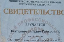 Воспитателю Зиатдиновой Алие Рануровне вручили Свидетельство Министерство образования и науки РТ за участие в республиканском профессиональном конкурсе "Воспитатель года-2019". Поздравляем коллегу с пофессиональными достижениями и желаем новых творческих успехов!