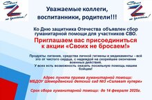 Просим Вас принять участие в Акции по сбору гуманитарной помощи для военнослужащих, участвующих в специальной военной операции (СВО). Среди наших близких, знакомых, коллег есть те, у кого родные уже выполняют боевые задачи на территории Украины, защищают интересы нашей Родины, совершают подвиги, проявляя мужество и героизм. Мы обращаемся с просьбой оказать содействие в проведении акции и внести свой посильный вклад в наше общее благородное дело. Сбор гуманитарной помощи осуществляется до 14 февраля 2025 года. -