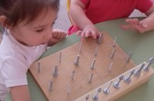 Педагог-психолог Нигматуллина Л.К. проводит с детьми ранней и первой младшей группы занятия для укрепление мышц кисти, развитие координации движений пальцев рук, формирование способности управлять движением кисти по показу, представлению, словесной команде. Для проведения этих упражнений ей пришлось смастерить тактильный мини-тренажер.