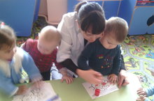 Дети второй группы раннего возраста занимаются с педагогом-психологом Нигматуллиной Ландыш Канифовной. Цель занятия: создание положительного эмоционального настроя в группе, развитие умения действовать соответственно правилам игры, развитие координации движений, общей и мелкой моторики, ориентации в собственном теле, зрительного восприятия (цвета, формы, размера предметов), внимание, речи и воображения.