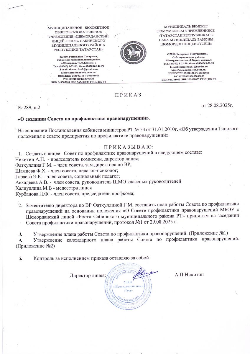 Приказ о деятельности Совета профилактики на 2025-2026 учебный год