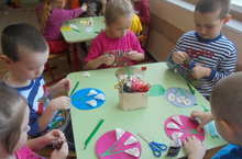 Иҗади сәнгать эшчәнлегендә балалар төсле кәгазьләрдән Россия флагы кисеп ябыштырдылар.Төсләренең нәрсә аңлатуы турында да сөйли алдылар