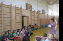 Бүген лагерьда хәрби –патриотик атналык башланып китте. Иртәнге аштан соң укучылар арасында башта Олимпия уеннары турында әңгәмә, аннары “Күңелле стартлар” уены үткәрелде. Икенче аштан соң укучылар Мишә елгасы буена экскурсиягә киттеләр. Алар анда уйнап, табигать кочагында ял итеп кайттылар.Обед ашаганнан соң Альберт Гыйлмуллович балаларга саф һавада уйнала торган яңа хәрәкәтле уеннар өйрәтте.