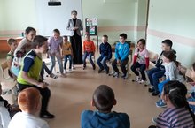 Бүгенге көн иртәнге гимнастикадан башланды. Укучылар ике командага бүленеп башваткычлар чиштеләр, тапкырлар һәм зирәкләр билгеләнде.Татар халык уеннары укучыларга бик ошады.Җырлы-биюле уеннарны бик теләп уйнадылар укучылар.