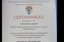 "Мәктәпкәчә яшьтәгеләрнең - ззләнү тәҗрибә проект эше" Бөтенроссия " Радуга открытый" конкурсында без "Экология һәм без" проект эше белән катнашып, " Иң актуаль тема" номинациясендә җиңү яуладык.Катнашкан өчен сертификат һәм җиңүче Дипломына лаек булдык. Балаларның эзләнү сәләтләрен үстерү һәм киңәйтү эшендә актив эш алып барганы өчен тәрбияче Гилемханова Р.Н. ,балаларны һәм педагогны оештырганы өчен бакча мөдире Мусина Ә.Г.лар рәхмәт хатлары белән бүләкләнде.