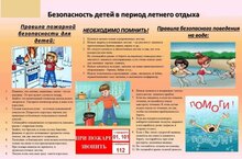 У вашего(ей) сына(дочери) появилось больше свободного времени для приключений и ребяческих фантазий, а у вас – забот и тревог за их безопасность. Во время летних каникул детей подстерегает повышенная опасность на дорогах, у водоёмов, в лесу, на игровых площадках, в садах, во дворах. Этому способствует погода, поездки и любопытство детей, наличие свободного времени и отсутствие должного контроля со стороны взрослых. Чтобы дети были отдохнувшими и здоровыми надо помнить ряд правил и условий при организации их отдыха с родителями, родственниками, друзьями: