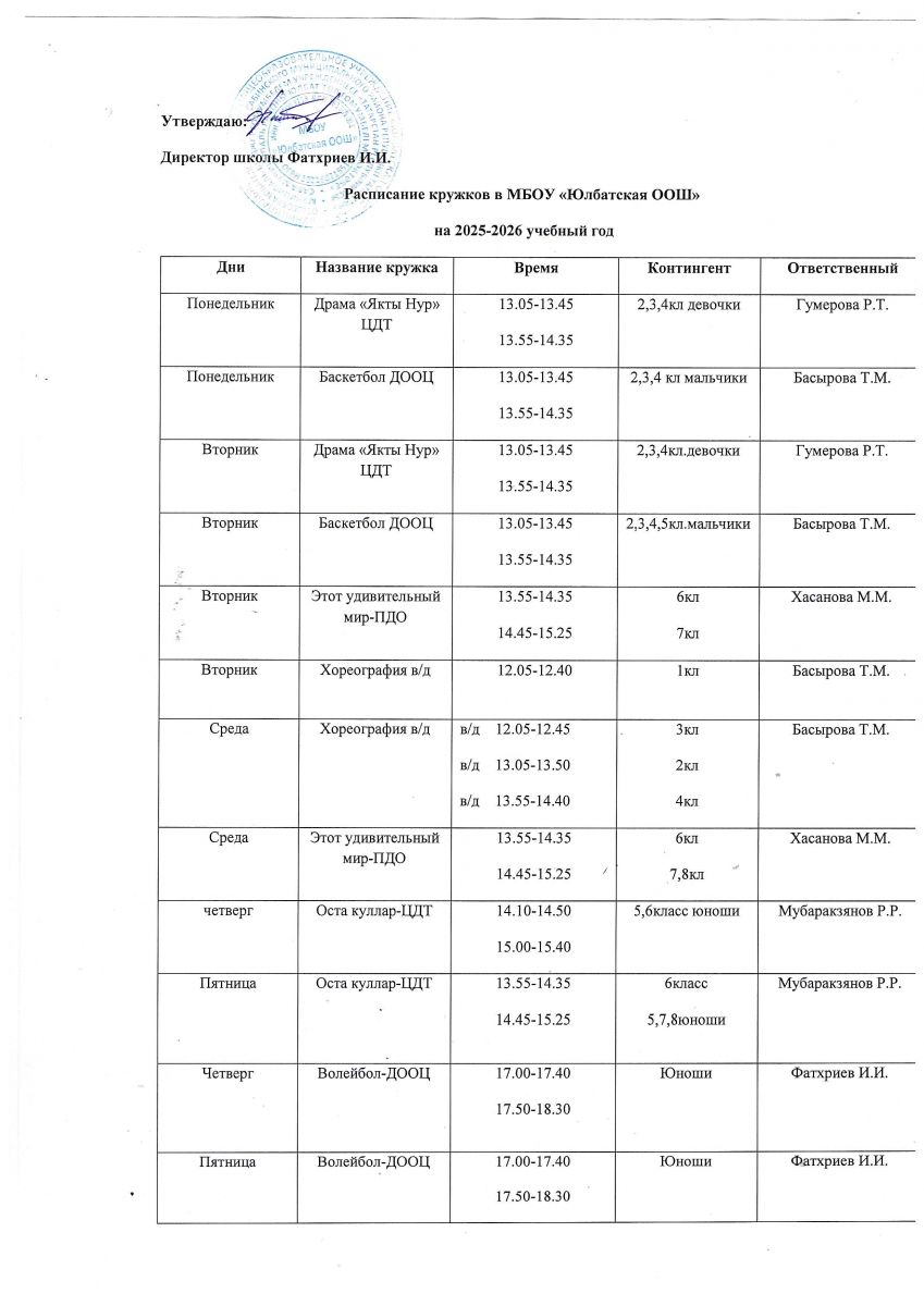 Расписание кружков МБОУ "Юлбатская ООШ" 2025-2026 уч.год