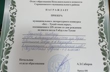22 апреля прошёл музыкальный литературный конкурс "Без-Тукай оныклары",посвящённый 135-летию со дня рождения великого поэта Габдуллы Тукая. Ученица нашей школы Гарипова Ильвина стала призёром в номинации "Художественное слово"(возрастная категория 1-3 классы). Поздравляем!