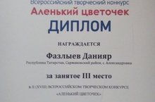 Учащиеся школы участвовали во Всероссийском творческом конкурсе "Аленький цветочек" .Фазлыев Данияр стал третьим призёром в номинации "Читаем сказку" в возрастной категории 7-10 лет.