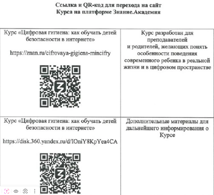 Ссылка и OR-код для перехода на сайт Курса на платформе Знание. Академия.На платформе Знание.Академия открылся онлайн-курс «Цифровая гигиена: как обучать детей безопасности в интернете», разработанный Российским обществом «Знание» совместно с АНО «Цифровая экономика». В ходе него наши педагоги научились лучше понимать особенности поведения современных детей в цифровом пространстве и распознавать разные типы угроз в интернете. По итогам курса педагоги научились находить системный подход к обеспечению кибербезопасности школьников: научились распознавать основные типы онлайн-угроз и их психологическое воздействие на детей, а также проводить профильные уроки. 9 педагогов нашей школы уже окончили онлайн курс.