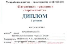 Поздравляем! 25.03.2025 Театральный кружок "Весёлая сцена" МБОУ "Азалаковская ООШ" участвовала в межрайонной научно-практической конференции "Патриотизм: традиции и современность", который призвана содействовать приобщению подрастающего поколения к гражданским и патриотическим ценностям, их духовному освоению через изучение героического прошлого и настоящего России, активизации научно-исследовательской деятельности учащихся на уроках и во внеурочной деятельности, популяризации работы научных обществ учащихся, который проводился в рамках объявленного Года защитника Отечества в Российской Федерации и приурочена к 80-летию Победы в Великой Отечественной войне 1941-1945 гг. и в секции "Zа Победу!" удостоен дипломом I степени отделом образования Исполнительного комитета Сармановского муниципального района Республики Татарстан. Конференция проводилась на базе инновационной муниципальной площадки "Гражданско-патриотическое воспитание как аспект социализации личности обучающегося" МБОУ "Старокаширская СОШ имени Зинната Хасанова. Руководители: Ибрагимова А.Н., Лукманова И.М. Поздравляем!