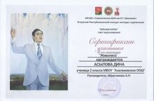 Поздравляем! 11.03.2025 Ученица 2 класса Асылова Дина награждена сертификатом участника открытого Республиканского конкурса молодых художников "Илһам нуры" ("Свет вдохновения") в номинации "Живопись". Руководитель: Ибрагимова А.Н. Поздравляем!
