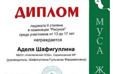 Поздравляем! 11.03.2025 Ученица 8 класса МБОУ "Азалаковская ООШ" Шафигуллина Аделя участвовала III Республиканском патриотическом конкурсе "Красная ромашка" ("Кызыл ромашка") среди детей школьного возвраста, который проводится в рамках объявленного в Российской Федерации Года защитника Отечества и посвященный 119 летию со дня рождения великого татарского поэта, Героя Советского Союза Мусы Джалиля и удостоен дипломом лауреата II степени в номинации "Рисунок" среди участников от 13 до 17 лет. Руководитель: Шафигуллина Г.Ф. Поздравляем!