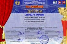 Поздравляем! 10.05.2025 Ученица 8 класса МБОУ "Азалаковская ООШ" Шафигуллина Аделя Рамисовна участвовала в Международном конкурсе-фестивале искусств "На Олимпе" и стала лауреатом, получив диплом I степени Продюсорского центра " A.G.L. PRODUCTION" при поддержке Министерства культуры республики Крым Департамента культуры города Москвы. Поздравляем, Аделя! Руководитель: Шафигуллина Г.Ф.