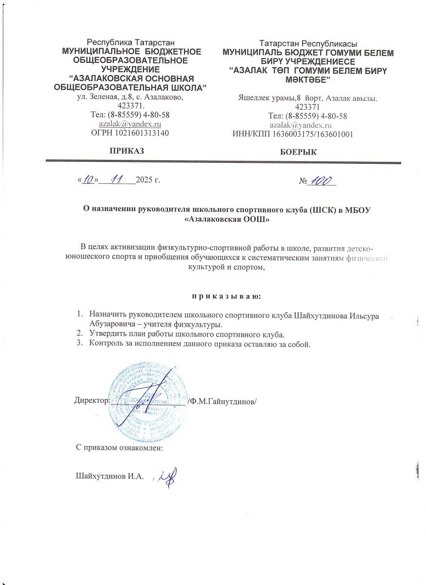 Приказ о назначении руководителя школьного спортивного клуба (ШСК) в МБОУ "Азалаковская ООШ"