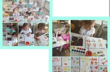Зурлар төркеме балалары яфраклардан эз калдыру ысулын кулланып көзге келәм рәсеме ясадылар./ Дети старшей группы техникой примакивания сделали осенний ковер.
