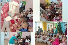 В последние годы благодаря администрации района в канун Нового года все дети получают новогодние подарки. Вот и этот год не исключение: все 109 детей нашего детского сада во время праздничных утренников стали счастливыми обладателями пакетов со сладостями прямо с рук Деда Мороза и Снегурочки. Выражаем благодарность администрации района за предоставленную радость детворе!/Соңгы елларда район Хакимияте ярдәме белән Яңа ел алдыннан барлык балалар да бүләкләр ала. Менә бу елны да, бәйрәм иртәләре вакытында безнең балалар бакчасының барлык 109 баласы да Кыш бабай һәм Кар Кызы кулыннан татлы пакетлар алды. Балаларыбызга шатлык биргәннәре өчен район хакимиятенә рәхмәт белдерәбез!