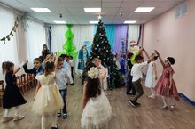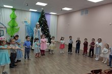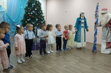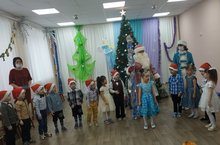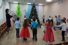 Красиво украшенный зал, нарядная елка, великолепные костюмы, подарки, Дед Мороз, Снегурочка и множество других сказочных персонажей ожидали наших воспитанников. Разноцветные, сверкающие гирлянды и ярко украшенная ёлочка принесли детям ощущение чуда. С самого начала представления сказочные герои увлекали детей в волшебный мир сказки. Дети окунулись в праздничную атмосферу приключений.. С появлением Деда Мороза начался настоящий праздник с песнями и танцами, хороводами вокруг ёлки. / Матур итеп бизәлгән зал, матур чыршы, искиткеч костюмнар, бүләкләр, Кыш Бабай, Кар Кызы һәм башка бик күп әкияти персонажлар безнең балаларны көтте. Төрле төстәге, ялтыравыклы гирляндалар һәм якты бизәлгән чыршы балаларга могҗиза хисе китерде. Тамаша башланганнан бирле әкият геройлары балаларны тылсымлы әкият дөньясына җәлеп итте. Балалар бәйрәм атмосферасына чумдылар. Кыш Бабай барлыкка килү белән җыр-бию, чыршы тирәли әйлән-бәйлән белән чын бәйрәм башланды.