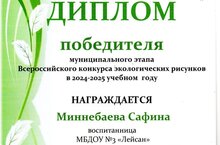 Наши воспитанники участвовали в муниципальном этапе Всероссийского конкурса экологических рисунков и стали победителями: Закирова Аида -подготовительная группа, Миннебаева Сафина -средняя группа; призеры:Долгунова Рената, Мухаметдинова Айзиля-2 младшая группа, Маликова Амелия -подготовительная группа. Участники конкурса: Кашапов Радэль,Хаков Ранель,Карамова Алия,Хазиев Шамиль,Ахмадишина Амелия,Галимов Малик,Салимгараева Гульфина. ПОЗДРАВЛЯЕМ!!! Благодарим родителей,которые поддержали наших воспитанников в их творчестве.