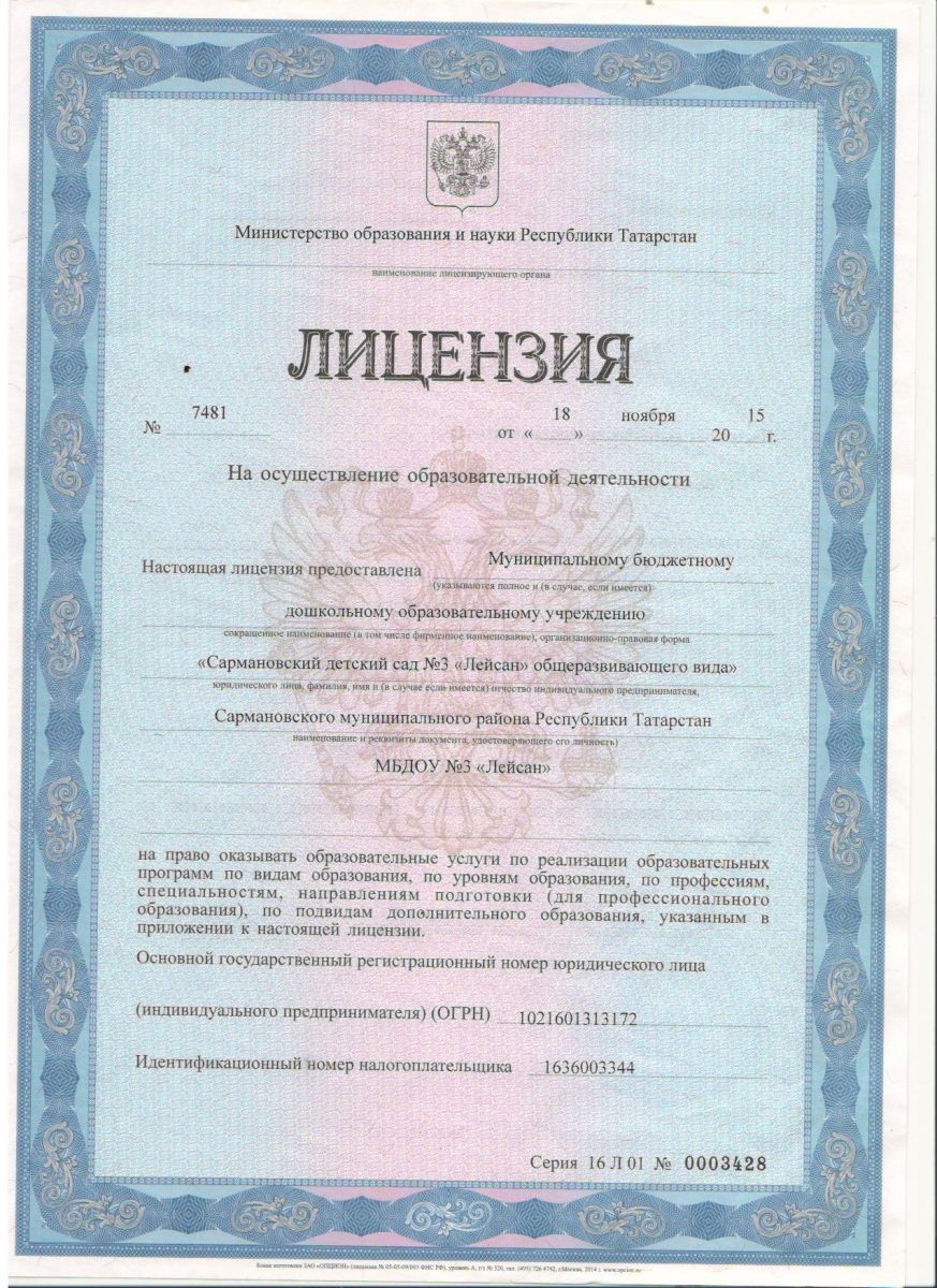 Муниципальное бюджетное дошкольное образовательное учреждение «Сармановский детский сад № 3 « Лейсан» общеразвивающего вида» Сармановского муниципального района Республики Татарстан / Татарстан Республикасы Сарман муниципаль районы "Гомуми үсеш төрендәге "Ләйсән" №3 Сарман балалар бакчасы" муниципаль бюджет мәктәпкәчә белем бирү учреждениесы