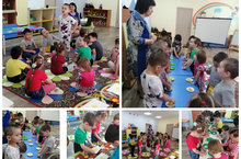Воспитатель первой квалификационной категории Вильданова Р.Р. поделилась с коллегами опытом организации образовательной деятельности по образовательной области "Познание". Рамиля Ранасовна организовала интегративную познавательно - исследовательскую и конструктивную деятельность с детьми второй младшей группы на тему "Солнышко". В ходе интересной и содержательной сюжетной игры малыши строили солнышко из геометрических фигур, складывали пазлы, рисовали нетрадиционным способом (вилкой). У детей на протяжении всего занятия было хорошее настроение./Беренче квалификацион категорияле тәрбияче Вилданова Р.Р. хезмәттәшләре белән "Познание"мәгариф өлкәсендә белем бирү эшчәнлеген оештыру тәҗрибәсе белән уртаклашты. Рамилә Ранасовна икенче кече төркем балалары белән "Кояшкай"темасына интегратив танып - белү-тикшеренү һәм конструктив эшчәнлек оештырды. Кызыклы һәм эчтәлекле сюжетлы уен барышында балалар геометрик фигуралардан кояш төзеделәр, пазллар салдылар, традицион булмаган ысул белән (вилка) ясадылар. Дәрес дәвамында балаларның кәефләре күтәренке иде.